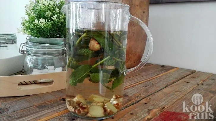 - Snijd de gember in stukjes en doe ze in een kan of fles. Voeg daar vervolgens de takjes munt aan toe en giet hier kokend water overheen tot het onderwater staat. Dit activeert de smaken.