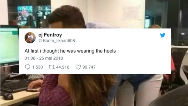 Een aantal dagen geleden deelde een jongen de onderstaande foto op Twitter. Op de foto zijn een jongen en een meisje te zien, maar het lijkt alsof... de jongen hakken aan heeft?! Wij moesten een aantal keer goed kijken voordat we de foto echt snapten en blijkbaar waren we niet de enige. Inmiddels heeft de foto al bijna 100.000 likes en is het 45.000 keer gedeeld op Twitter.